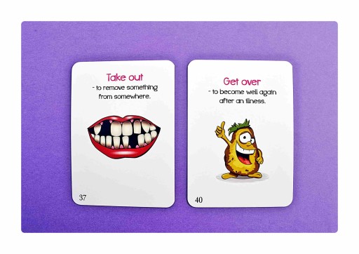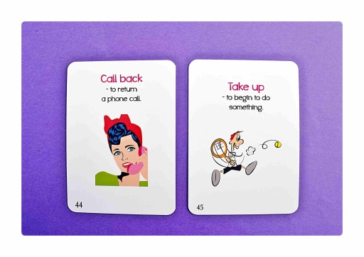 Zestaw zawiera 50 popularnych czasowników frazowych, 50 klarownych definicji i zdań obrazujących ich użycie, 50 obrazków oraz 50 pytań zmuszających uczniów do rozmowy. Karty mogą służyć jako fiszki lub jako ekscytująca gra do nauki języka angielskiego.
