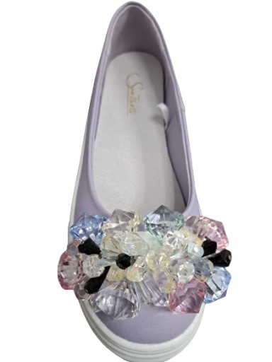 Baleriny firmy SANTORIO. Model wykonany z wysokiej jakości skóry ekologicznej. Obuwie wyróżnia się ozdobnymi kamykami, które dodają blasku, są trwałe i wygodne. Obuwie możemy dopasować do stylizacji codziennych jak i wieczorowych.