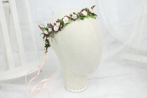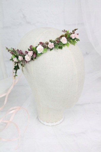 Wianek komunijny upleciony z kwiatów róż, zdobiony listkami bluszczu i pięknych traw.