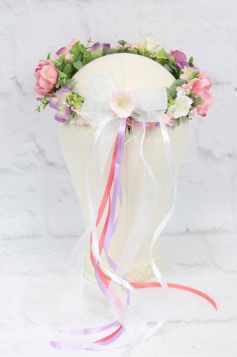 Dodatkowo jest możliwość do wianuszka dokupić szyfonową kokardkę z różą czy kwiatem wiśni na grzebyku lub girlandę z kwiatami również na grzebyku, można je wpiąć w tył wianuszka by był bardziej okazały.