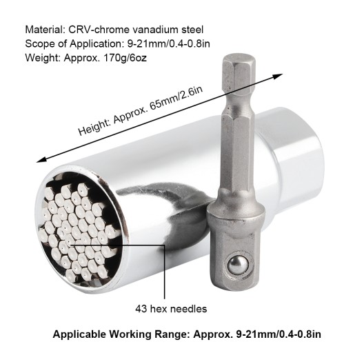 1. Najwyższej jakości stal chromowo-wanadowa, solidna i trwała, o długiej żywotności. Wewnętrzne stalowe kolumny są wykonane ze stali chromowo-wanadowej o wysokiej twardości i dużej nośności. 2. Umożliwia demontaż wszystkich typów śrub i nakrętek za jednym razem. Ma niewielkie rozmiary, jest łatwy do przenoszenia, może być również używany z kluczami grzechotkowymi i pneumatycznymi kluczami grzechotkowymi. 3. Idealny dla przemysłu motoryzacyjnego, konserwacji gospodarstw domowych, przemysłu wytwórczego, stolarki, naprawy samochodów, budownictwa i innych gałęzi przemysłu. 4. Szybki i łatwy demontaż oraz montaż wszelkiego rodzaju śrub, haków, wkrętów do drewna, łbów śrub itp. Samodopasowuje się, aby pasował do tysięcy elementów złącznych. 5. Zdejmowane śruby, obrotowe haki, demontaż śruby z łbem płaskim. Usuwanie nieregularnych śrub i usuwanie uszkodzonych kranów, dokręcanie pokręteł. 6. Narzędzie niezbędne zarówno dla profesjonalisty, jak i przeciętnego człowieka, praktyczne w użyciu. 7. Uniwersalny adapter klucza nasadowego do wiertarek elektrycznych i kluczy grzechotkowych, który natychmiast dostosowuje się do chwytania nakrętek sześciokątnych, haczyków, śrub oczkowych i do drewna, łbów śrub i innych obiektów o różnych kształtach i rozmiarach.