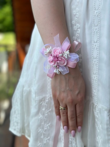 Uroczy bukiecik na rękę w romantycznym stylu, wykonany ręcznie z dbałością o detale, z wysokiej jakości elementów.