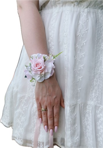 Uroczy bukiecik na rękę w romantycznym stylu, wykonany ręcznie z dbałością o detale, z wysokiej jakości elementów.