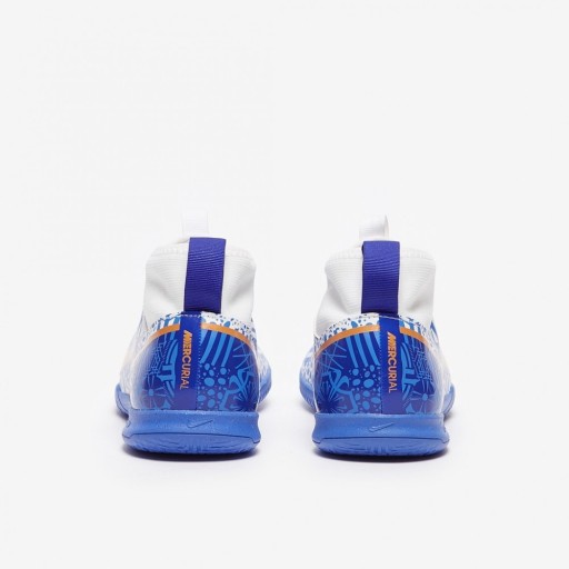 Halówki Nike Jr Zoom Superfly 9 Academy CR7 IC wykonane z wysokiej jakości skóry syntetycznej. Korki w kolorze biało-niebieskim ze złotymi akcentami. Buty nowe, oryginalne, w pudełku (pudełko może nie zawierać górnego wieczka). Czyścić zgodnie z zaleceniami producenta.