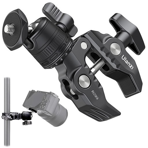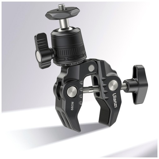 Super stabilny uchwyt szczękowy Ulanzi R099 z głowicą 360 stopni umożliwia przymocowanie aparatu, kamery lub telefonu do kierownicy roweru, poręczy, blatu, a nawet gałęzi drzewa.