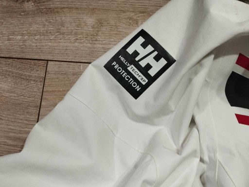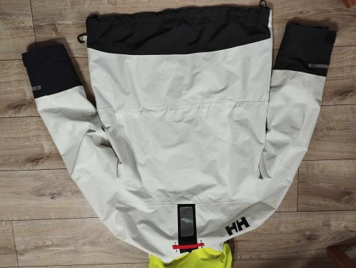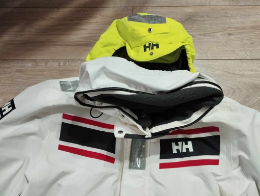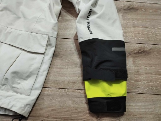 Helly Hansen profesjonalny sztormiak kurtka żeglarska sailing jacket L. Membrana Helly Tech XP Protection Bez uszkodzeń ale z niedużymi przybrudzeniami ze zwykłego używania ( ostanie zdjęcie - w miejscu wkładanie ręki do kieszenie nieduże zabrudzenie ) Kieszenie zewnętrzne i wewnętrzne , stopery w biodrach i pasie do lepszego dopasowania. Regulowany odblaskowy kaptur chowany w bardzo wysokim kołnierzu. Wewnątrz rękawów dodatkowy mankiet . W wielu miejscach logowana i z odblaskami