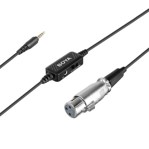 Kabel mikrofonowy z wbudowanym przedwzmacniaczem, łączący mikrofon (XLR) ze sprzętem z wejściem 3.5mm TRRS.