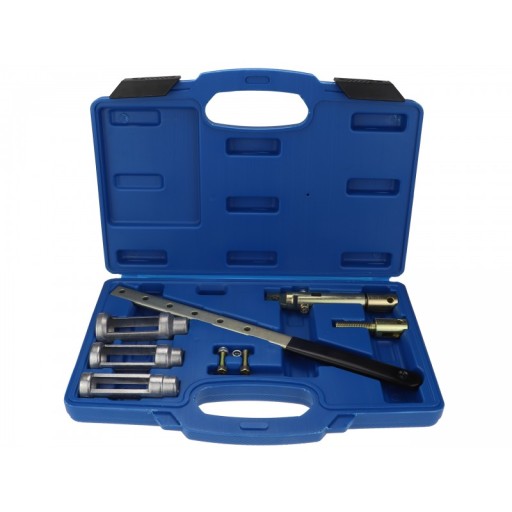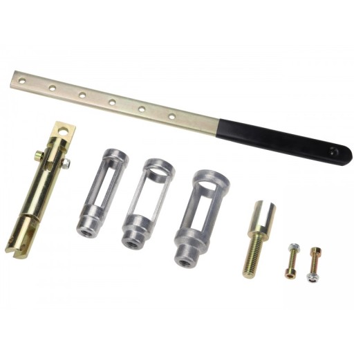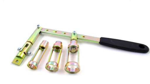 Dźwignia do ściskania sprężyn zaworowych z zestawem trzech różnych końcówek montażowych. Przyrząd znajduje zastosowanie w silnikach 8V, 12V 16V. Produkt z regulacją wysokości.