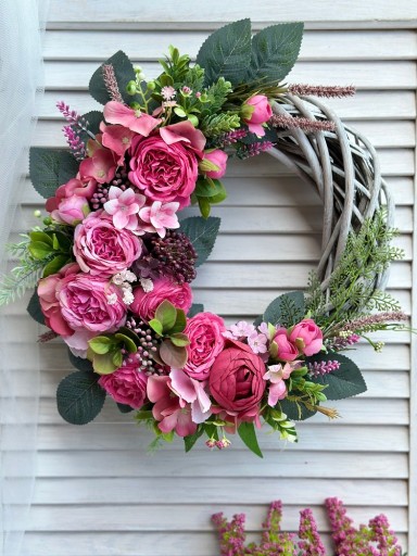 WIANEK WIOSENNY KWIATOWY NA DRZWI WIKLINOWY STROIK WIENIEC RÓŻOWY RÓŻE