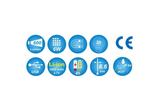 - ładowarka: 110-240V AC/DC, kabel USB- czas pracy: niski poziom światła 6 godz. wysoki poziom światła 3 godz. latarka 7 godz