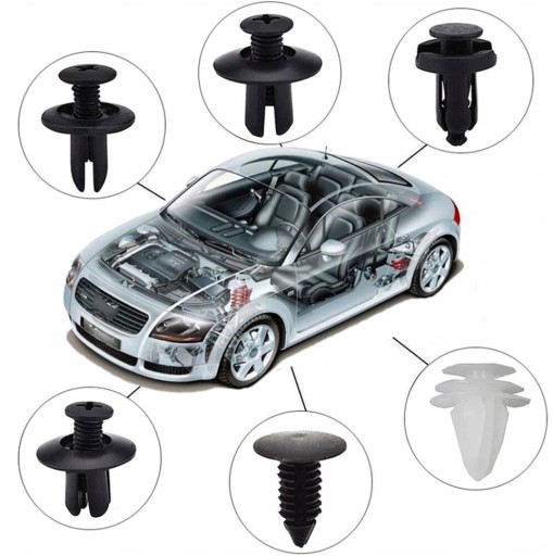 Zestaw 100 spinek, kołków samochodowych. W komplecie 6 najpopularniejszych rodzajów klipsów posegregowanych po 10 i 20 sztuk w wygodnym pudełku z przegródkami. Wszystkie kołki są opisane wraz ze szczegółowymi rozmiarami.
