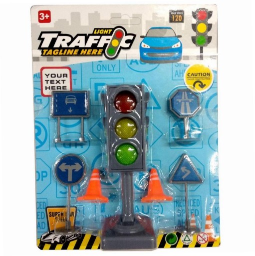 W zestawie sygnalizator i znaki drogowe. Sygnalizator na baterie świeci, zmienia kolory świateł.