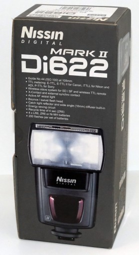 Lampa Nissin Di622 Mark II jest następcą modelu Di622. Lampa błyskowa jest przeznaczona do lustrzanek cyfrowych i aparatów cyfrowych wyposażonych w najnowszą technologię sterowania błyskiem – TTL. Typ N jest przeznaczony do lustrzanek cyfrowych Nikon, modeli D40, D40x, D50, D70, D70s, D80, D90, D7000 oraz D200 i D300. Po zamocowaniu lampy Di622 do aparatu prawie wszystkie funkcje lampy kontrolowane są przez automatykę aparatu. Jeśli w aparacie został wybrany któryś z poniższych trybów: [P] (Program), [□] (Pełna automatyka), [Av] (Priorytet przysłony),[Tv] (Priorytet czasu migawki),[M] (Manualny), to lampa Di622 działa w automatyce ETTL i ETTL-II. Dzięki temu siła błysku jest zawsze automatycznie kontrolowana przez aparat i możliwe jest osiągnięcie optymalnej ekspozycji. Lampa nie nosi żadnych śladów użytkowania.
