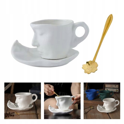 Kubki z ludzką twarzą: Znakomity design, z łyżeczką w kształcie kwiatu i podstawką z ludzką twarzą, piękną i delikatną, wniesie artystyczny motyw do twojego stołu.