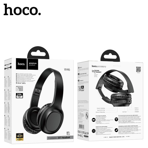 hoco. W46 Charm to bezprzewodowe słuchawki nauszne / nagłowne, łączone bezprzewodowo z urządzeniami mobilnymi za pomocą technologii Bluetooth 5.3, posiadają złącze AUX Jack 3.5mm oraz wyposażone są w mikrofon dający możliwość prowadzenia rozmów telefonicznych jak i przyciski do sterowania muzyką lub rozmowami.
