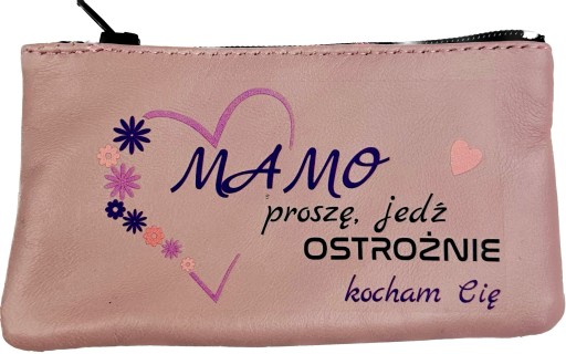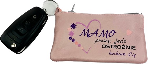 - Etui na klucze z naturalnej skóry zdobione nadrukiem "MAMO PROSZE JEDŹ OSTROŻNIE KOCHAM CIĘ"