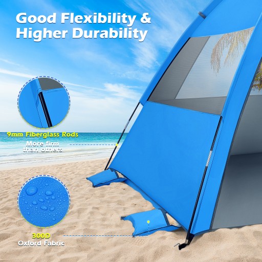 Ten namiot plażowy wykonany jest z tkaniny pokrytej powłoką anty-UV, która zapewni Tobie i Twojej rodzinie silną ochronę przed słońcem podczas wakacji nad morzem. Jest lekki i można go złożyć do niewielkich rozmiarów, przenośny do podróży na zewnątrz. Dzięki przejrzystym instrukcjom użytkowania można go łatwo złożyć i zdemontować.