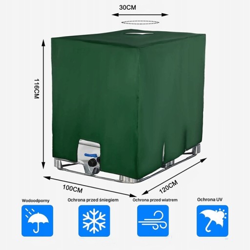 Ta zielona pokrywa UV do pokrywy IBC o pojemności 1000 l ma wymiary 116 x 100 x 120 cm. Łatwa do przenoszenia dzięki torbie do przechowywania do wielokrotnego użytku i używania po złożeniu, aby zaoszczędzić miejsce. Dzięki temu będziesz mógł korzystać z niej przez wiele lat.