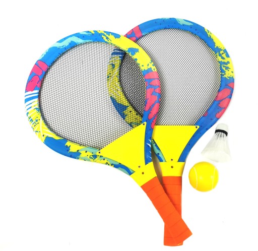 W zestawie znajdują się paletki plażowe, czyli rakietki większych rozmiarów niż te standardowe. Otoczone są miękkim kolorowym materiałem. Środek to wzmocniona siatka, gęsto spleciona. Rączka paletki jest krótka i otoczona gąbczastym, miękkim materiałem.