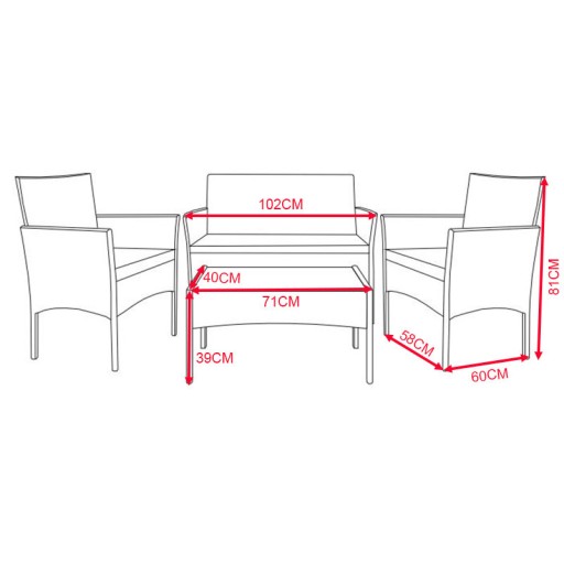 - Materiał: Stabilna stalowa konstrukcja pokryta technorattanem w kolorze antracyt, szkło ciemne, ciemno - szara tkanina poduszek