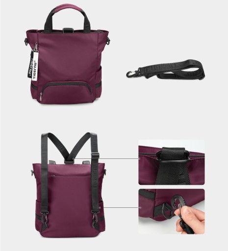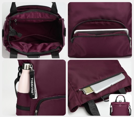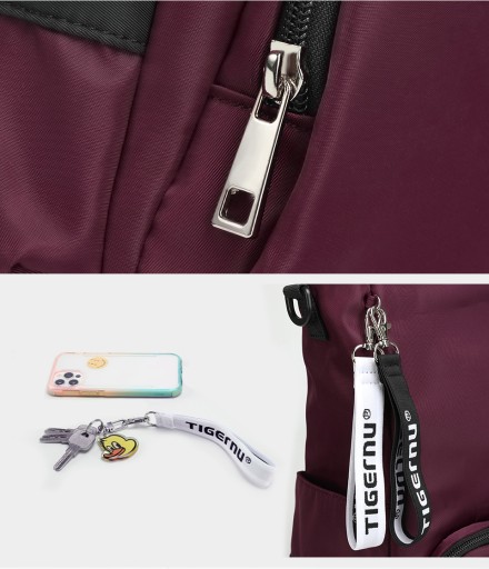 Damska torba/plecak na laptopa marki Tigernu o symbolu T-S8169 jest lekka i pojemna. Wykonana jest z wodoodpornego i odpornego na zadrapania materiału - nylonu. Z przodu znajduję się półokrągła kieszeń zapinana na zamek na podręczne rzeczy. Po bokach umieszczono kieszenie na napój lub parasolkę. Z tyłu pod rantem materiału umieszczono dużą kieszeń, w której bezpiecznie możesz przechować portfel lub telefon. Główna komora zapinana jest na zamek, a w środku znajduje się dużo miejsca na zapakowanie rzeczy, kieszeń nalaptopa w rozmiarze do 14,1 oraz mała kieszonka zapinana na zamek. Torba posiada dwa uchwyty do przenoszenia w ręce oraz przypinany pasek, dzięki któremu można przewiesić ją przez ramię. Torbę można również nosić na plecach jak plecak, po odpowiednim przypięciu paska w taki sposób, aby stworzył on szelki. Do torby dołączono dwie czarno-białe smycze z logiem producenta, które mogą służyć jako ozdoba plecaka lub można je przypiąć do kluczy i używać oddzielnie. Ta pojemna, wygodna i nowoczesna torba/plecak w stylu worka na pewno przypadnie do gustu niejednej kobiecie.