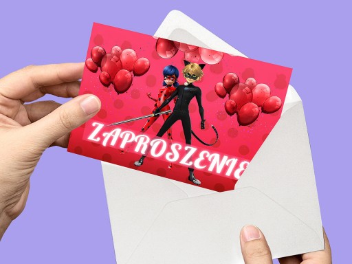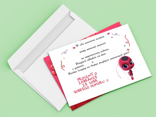 ZAPROSZENIE BIEDRONKA I CZARNY KOT NA URODZINY DZIECKA + KOPERTA GRATIS