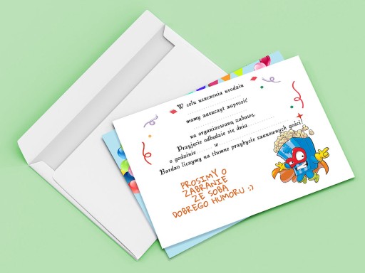 - Dwustronny Zadruk: Nasze zaproszenia pełne są zabawnych motywów i kolorowych ilustracji, które z pewnością rozbawią każde dziecko.