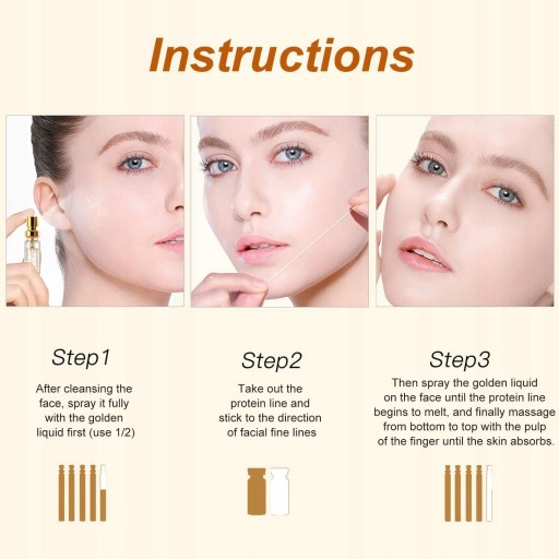 Zastosowanie: po oczyszczeniu nanieść równomiernie złoty płyn na twarz, następnie przyklej linię proteinową razem ze strukturą skóry na twarz i czoło, następnie nanieść złoty płyn na pozycję linii proteinowej i delikatnie wmasować, aż do wchłonięcia.