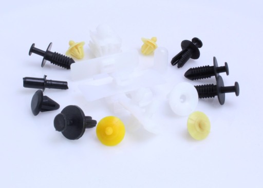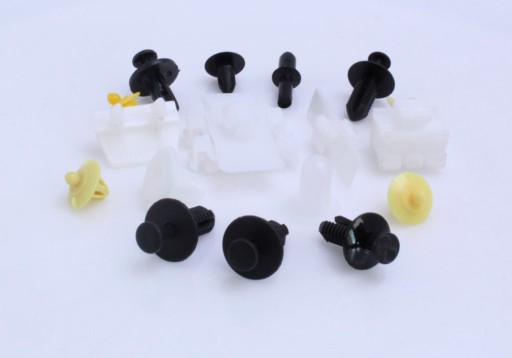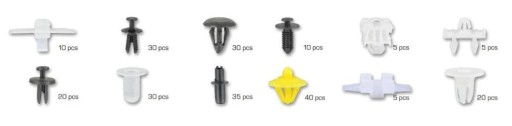 - Zestaw 12 różnych typów klipsów, w tym klipsy mocujące, zatrzaski, przelotki, klipsy ustalające, klipsy do listewek.