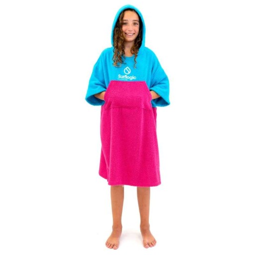 Poncho Surf Logic Junior Cyan & Neon Pink. Bardzo wygodny dodatek na plażę lub basen do przebierania lub docieplenia.