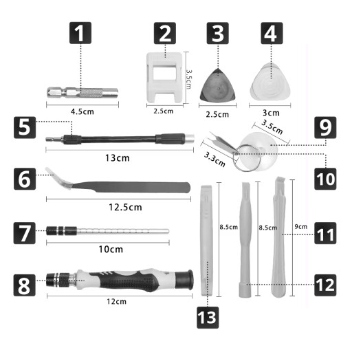 - Zawartość zestawu: 100 bitów, ergonomiczny wkrętak, przedłużki giętkie i sztywne, adapter do wkrętarki, pęseta precyzyjna, przyssawka do demontażu ekranów, otwieracze do obudów, szpilki do wysuwania kart SIM, kątowe otwieracze do obudów, plastikowe etui, magnetyzer/demagnetyzer