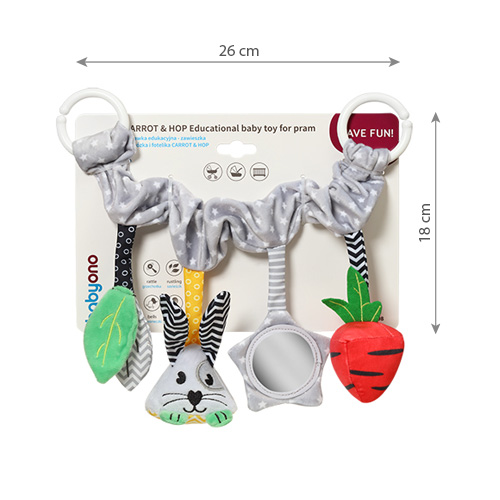 Edukacyjna zawieszka Carrot & Hop z akcentami kontrastowymi urozmaici świat Twojego dziecka i pomoże w rozwoju koordynacji wzrokowo-słuchowej oraz motorycznej. Przymocuj ją do wózka, kołyski lub fotelika a zajmie maluszka w trakcie spacerów czy podróży. Na pokrytej przyjemnym w dotyku materiałem zawieszce umieściliśmy szeleszczący listek i grzechoczącego króliczka z kontrastowymi uszami. Twój maluch znajdzie także lusterko oraz delikatnie grzechoczącą marchewkę. Ciekawie dobrane elementy są miłe w dotyku i przyciągają uwagę malucha różnorodnymi wzorami i kolorystyką. Pozwalają Twojemu maluszkowi na odkrywanie świata i kształtowanie sprawności manualnych w ramach zabawy.
