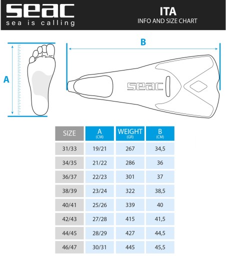 Tabela rozmiarów krótkich płetw SEAC ITA