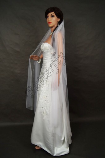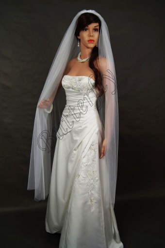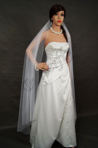 Przedmiotem sprzedaży jest welon klasyczny pojedynczy o długości 160cm z ciętymi brzegami, szerokość welonu 300cm, jest gęsto marszczony przy grzebieniu. Dół jest cięty na prosto. Wykonany z tiulu muślinowego. Posiada wszyty bezbarwny grzebień. Welon doskonale prezentuje się wpięty nad kokiem jak również w dolnej części uczesania.
