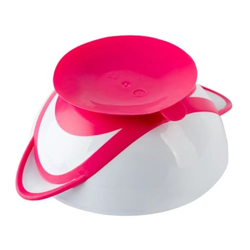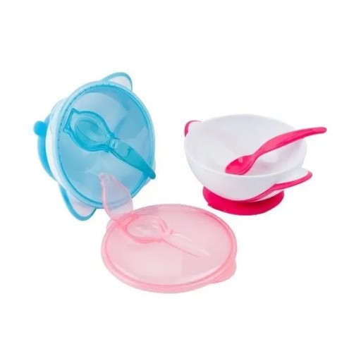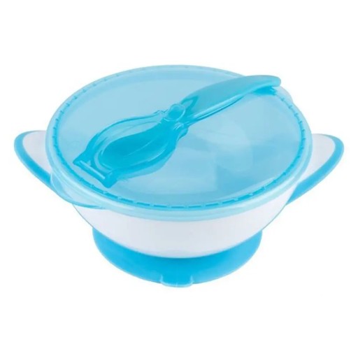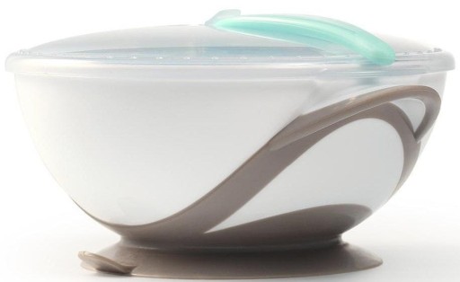 Miseczka z przyssawką i łyżeczką to produkt przydatny na spacerze lub w podróży. Miękka przykrywka szczelnie chroniąca pokarm została wyposażona w system ułatwiający przechowywanie, dzięki któremu łyżeczka nie zabrudzi się, ani nie zgubi. Gumowa przyssawka uniemożliwia przesuwanie się miseczki po stole. Wykonana z bezpiecznych materiałów prze-znaczonych do kontaktu z żywnością, produkt jest całkowicie wolny od Bisfenolu A. Można ją stosować w mikrofalówce, a także myć w zmywarce.