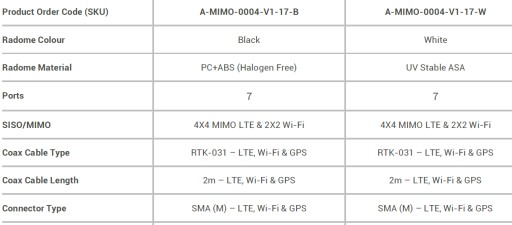 MIMO-4-17 to wysokowydajna antena wieloczęstotliwościowa 7 w 1 w jednej obudowie. Antena zapewnia cztery łącza komórkowe, dwa Wi-Fi i antenę GPS/GLONASS. Dwie anteny komórkowe MIMO oferują szerokopasmowy zasięg od 617 do 6000 MHz, obejmujący współczesne pasma LTE/4G i 5G, co pozwoli na wdrożenie ich w przyszłości. Ultraszerokopasmowa wydajność anten komórkowych pozwala na stosowanie ich przez różnych operatorów i technologie oraz jest gotowa na przyszłe technologie komórkowe do 6 GHz dla aplikacji 5G, a także aplikacje Wi-Fi od 5 do 6 GHz.