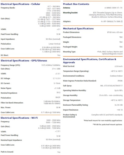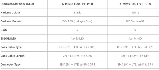 Antena jest również wyposażona w cztery dwuzakresowe anteny Wi-Fi, zapewniające równoczesne pasmo 2,4 GHz i 5 do 7,2 GHz na każdej antenie dla funkcji 4x4 MIMO. MIMO-4-19 przewyższa wydajność większości konkurentów ze względu na dbałość o konstrukcję tej wysokowydajnej anteny. Wzorce promieniowania wszystkich elementów promieniujących zapewniają doskonałą równowagę między wielokierunkowością, różnorodnością wzorców i dobrymi zdolnościami promieniowania na żądanej wysokości. Jest to ważne kryterium dla rynku transportowego i morskiego, dla którego antena została specjalnie zaprojektowana. Główne zastosowania to pojazdy komercyjne/przemysłowe, systemy morskie, M2M i inne systemy IoT wykorzystujące szeroką gamę technologii radiowych, przy jednoczesnym zachowaniu przyszłości w szerokim paśmie częstotliwości.