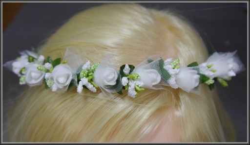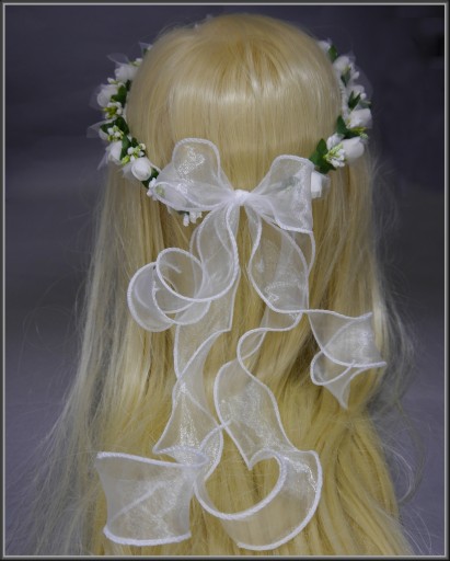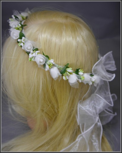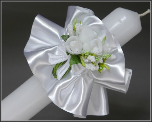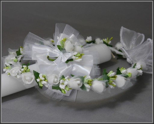 Komplet komunijny: Ozdoba na rączkę, okapnik z taśmy satynowej premium. Torebka komunijna w kształcie woreczka z prostym dołem. Wykonana z satyny atłasowej odszytej na matową stronę. Na życzenie możemy odszyć torebkę na błyszczącą stronę. Wianek komunijny biało - zielony wiązany. Obwód wianka do wiązania 49 cm. Na naszych pozostałych aukcjach można kupić każdy produkt osobno.