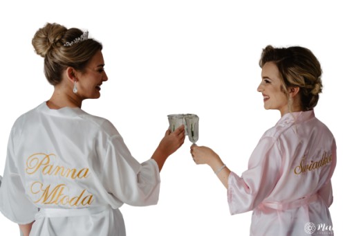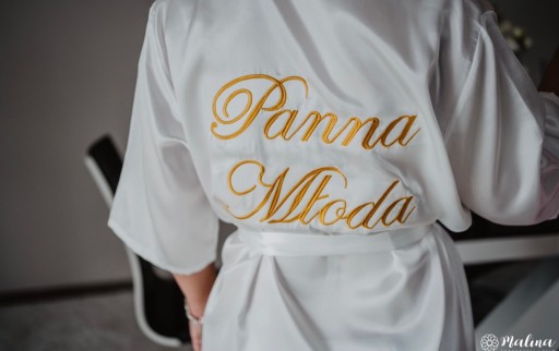 Elegancki szlafrok z delikatnej satyny, materiał nie prześwituje spokojnie można go założyć na bieliznę. Szeroki rękaw. Szlafrok wiązany paskiem. Wykonany z ekskluzywnym haftem złotą nicią Panna Młoda w kolorze białym oraz w kolorze różowym z napisem Świadkowa. Aukcja dotyczy kompletu dla Panny Młodej oraz Świadkowej.