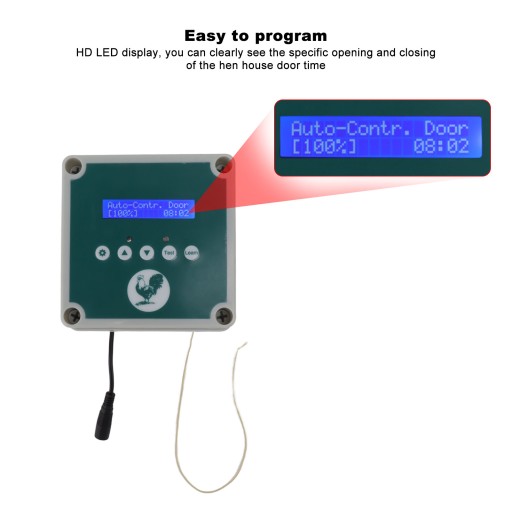 2. Łatwy w użyciu: sterownik można łatwo zaprogramować dzięki dobrze oznakowanym przyciskom. Otwiera się automatycznie rano i zamyka wieczorem, oszczędzając czas i wysiłek.