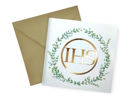 Karnet w formacie 15 x 15 cm. Wydrukowany na wysokiej jakości papierze. Uszlachetniony złotym metalicznym lakierem 3D. W zestawie perłowa koperta.