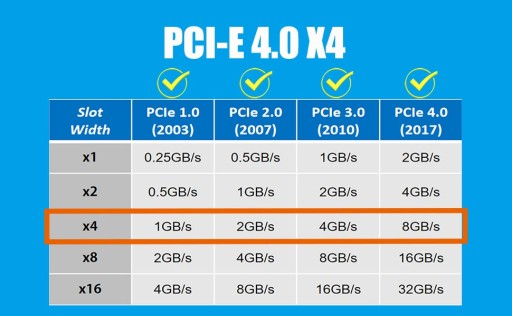 - Aby osiągnąć pełną prędkość PCIe 4.0 X4 (64 Gb/s), procesor i gniazdo PCIe płyty głównej oraz dysk SSD PCIe M.2 muszą obsługiwać technologię PCIe 4.0 (Uwaga: PCIe 4.0 nie jest obsługiwane przez procesory Intel poniżej 11. generacji)