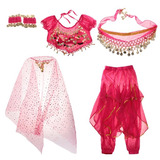 Zestaw kostiumów do tańca brzucha, w tym top, spodnie haremki, chusta na biodra i para opasek na nadgarstki