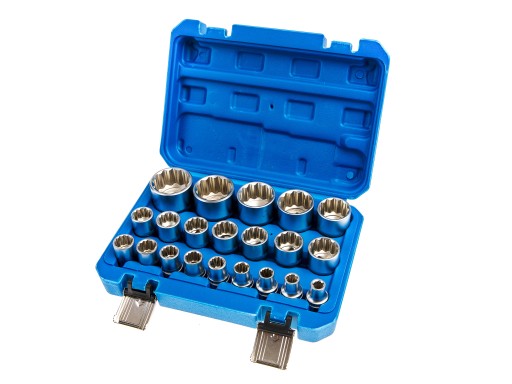 Praktyczny zestaw kluczy SPLINE z nasadką 1/2" w plastikowej walizce do przechowywania. W zestawie 21 sztuk w popularnych rozmiarach. Nasadki opracowane z myślą o profesjonalnym zastosowaniu. Wykonane są z wytrzymałej stali chromowo-wanadowej.