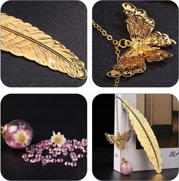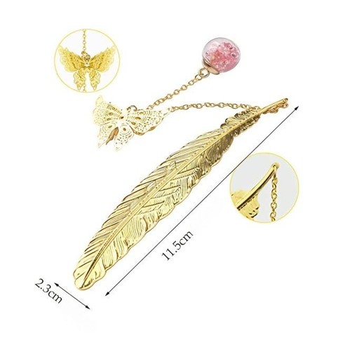 zakładka do książki z motywem pióra, motyla oraz kuli 3D z kryształkami i kwiatem, idealnie sprawdzi się dla miłośników książek.