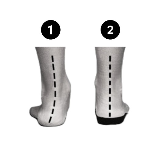 1️⃣ Stopa bez wkładki: zrotowana do wewnątrz, zauważalna koślawość, rozciągnięte ścięgno Achillesa, które w takiej pozycji jest bardziej narażone na kontuzje oraz spłaszczony łuk stopy. Ponadto brak dodatkowego wsparcia i amortyzacji.