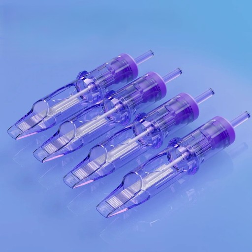 - Wysokiej jakości silikon utrzymujący elastyczność igły. Korpus kartridża jest przezroczysty w kolorze fioletowym, co pozwala zobaczyć całe wnętrze i ilość atramentu.