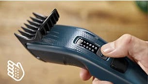 Wystarczy wybrać i zablokować żądane ustawienie długości. Regulowana nasadka grzebieniowa zapewnia 12 blokowanych ustawień długości od 1 mm do 23 mm. Odstęp pomiędzy kolejnymi ustawieniami wynosi dokładnie 2 mm. Można również zdjąć nasadkę i krótko przyciąć włosy na długość 0,5 mm.