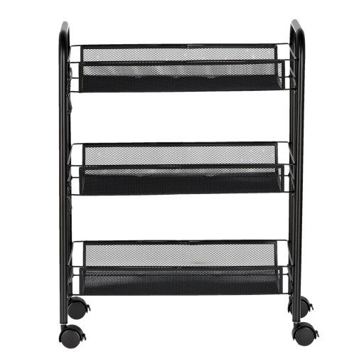 Pomocnik na kółkach wykonany ze stali nierdzewnej proszkowanej. Posiada trzy głębokie koszyki. Regał na obrotowych (360°) kółkach. Dwa z nich posiadają blokadę, dzięki której wózek stabilnie stoi nawet na nierównej powierzchni. Posiada solidne uchwyty ułatwiające przenoszenie, oraz 4 haczyki które można przypiąć bądź zawiesić.