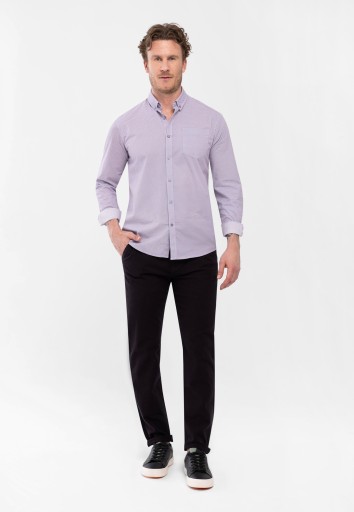Męskie chinosy R-PARKS, to ponadczasowy fason, który pasuje do wszystkiego! Uniwersalność to nie jedyna cecha tych spodni. Są przede wszystkim wygodne. Czarne spodnie R-PARKS mają fason typu Regular, co oznacza, że spodnie nie są ani zbyt mocno przylegające do sylwetki, ani zbyt luźne. To krój odpowiedni dla panów o klasycznej budowie ciała. Spodnie R-PARKS to klasyczne chinosy z dwiema skośnymi kieszeniami i jedną małą kieszonką z przodu, a także dwiema wpuszczanymi kieszeniami na guzik z tyłu. Również splot tkaniny jest ciekawą ozdobą - materiał ma lekko wypukłą strukturę!